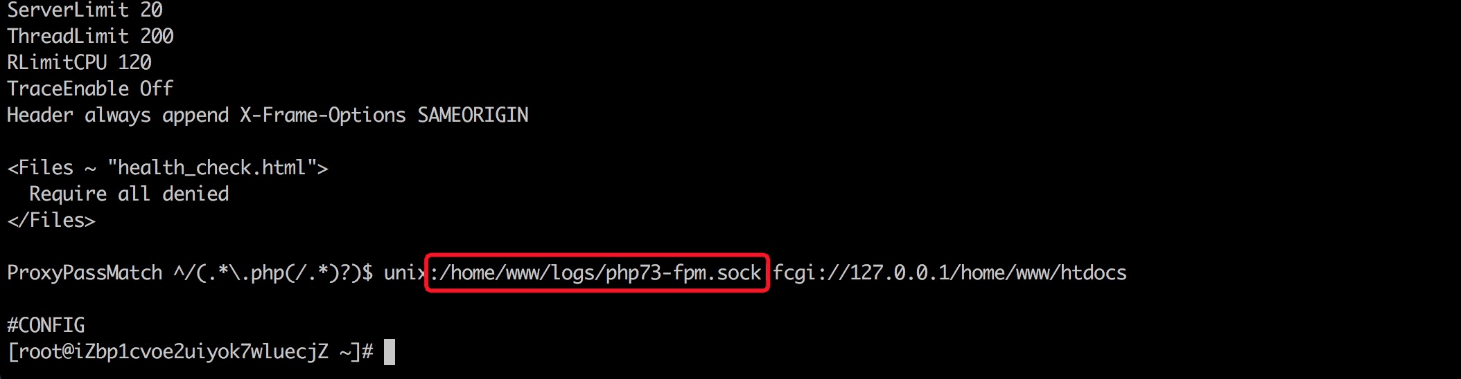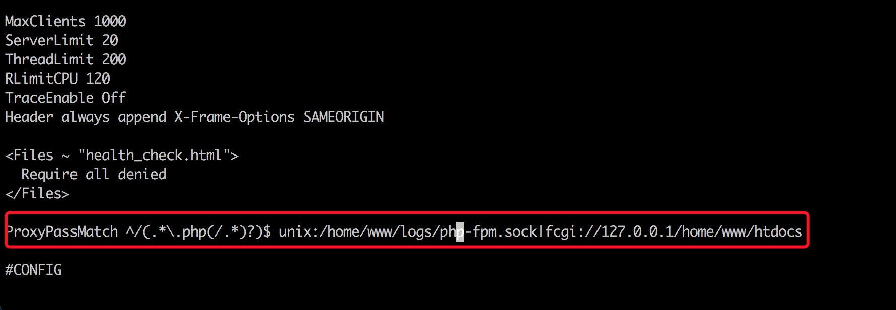 镜像中默认是用的php-fpm,使用的是socket方式的监听,Apache对应配置文件/usr/local/apache/conf/httpd.conf,其中配置如下: