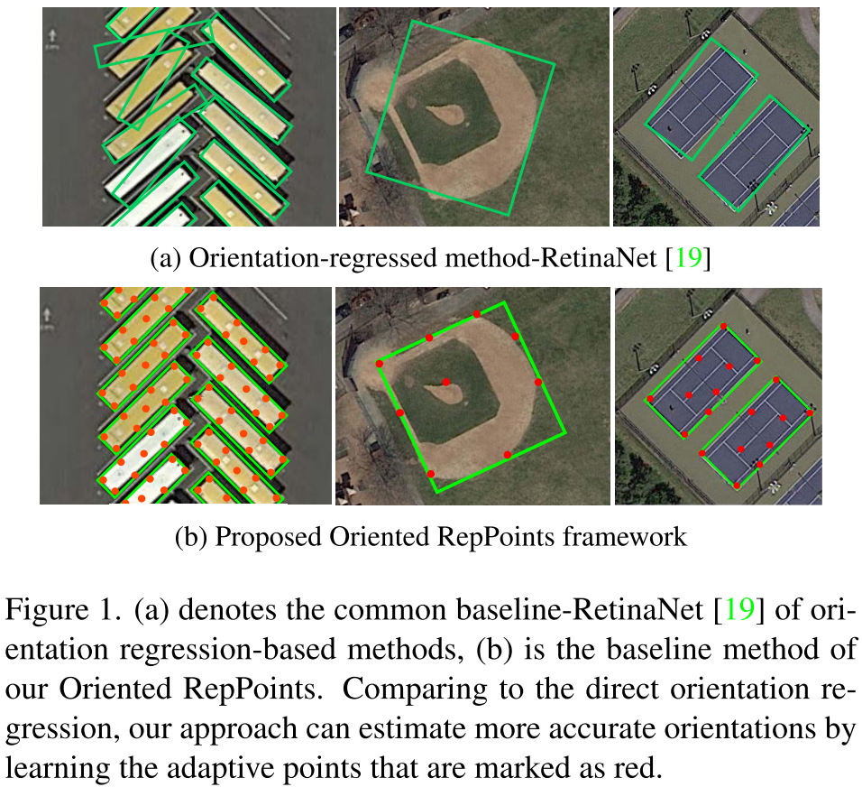作者提到航拍图像中目标具有非水平,任意方向,密集分布,背景复杂等困难,主流的方法大多将其视为简单的旋转目标检测问题。其中基于角度回归的方法最受欢迎,然而这种增加了角度预测的方法会面临损失的不连续性以及回归的不一致性问题。这是因为角度的有界周期性和旋转框的方向定义造成的。因此为了避免这种问题,一些方法重新定义了目标旋转框的表示方法。例如,基于点集表示的方法RepPoints可以捕获关键的语义特征。但是这种简单的转换函数只产生垂直-水平边界框,无法精确估计航拍图像中旋转物体的方位。同时RepPoint在忽略学到的点集的质量的同时只根据语义特征回归关键点集,会导致旋转的、密集分布的和复杂背景下的目标精度较差。
