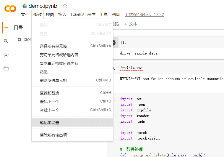 编写代码,连接Colab的GPU:点击左上角“修改-笔记本设置-GPU”