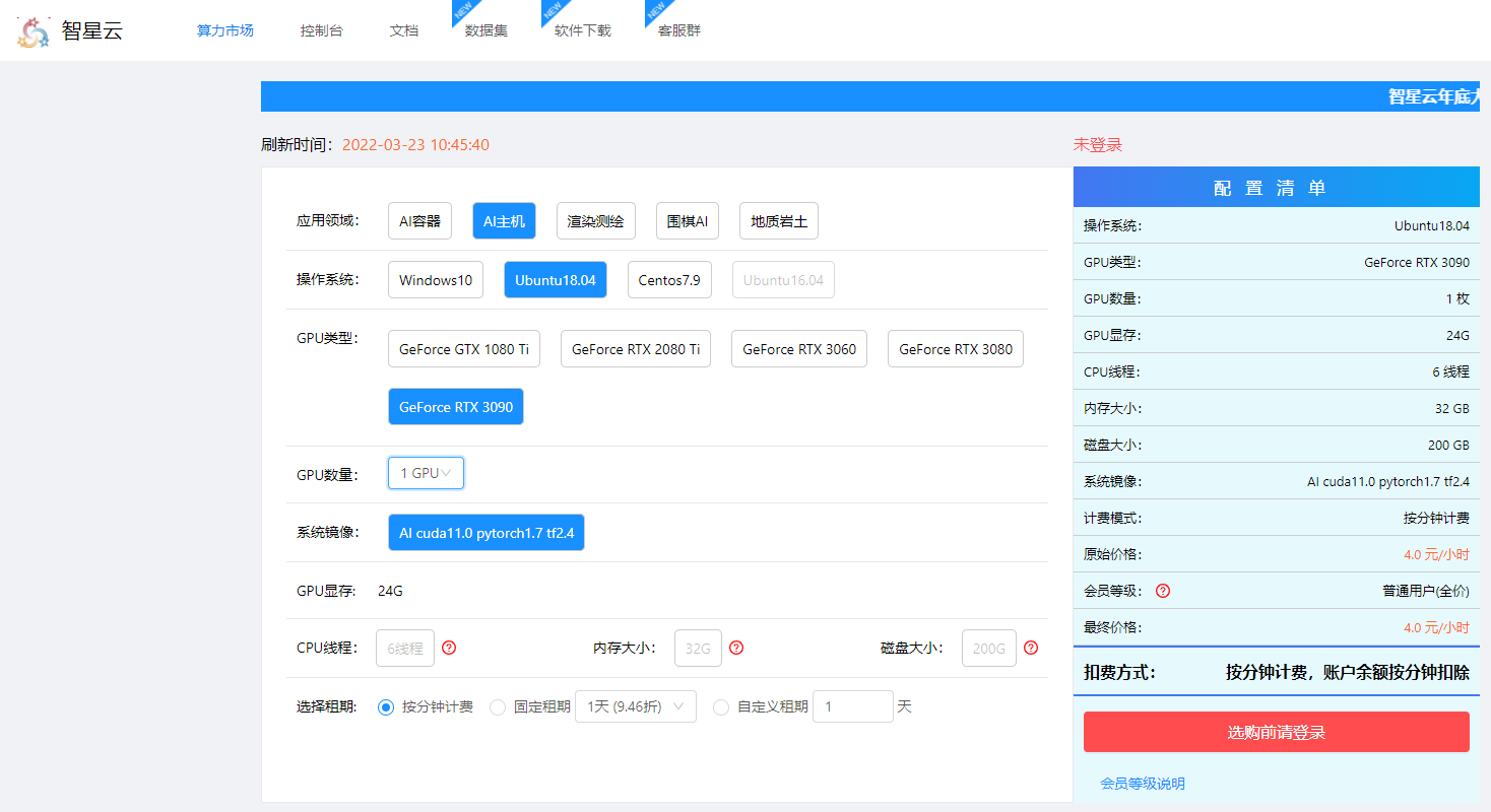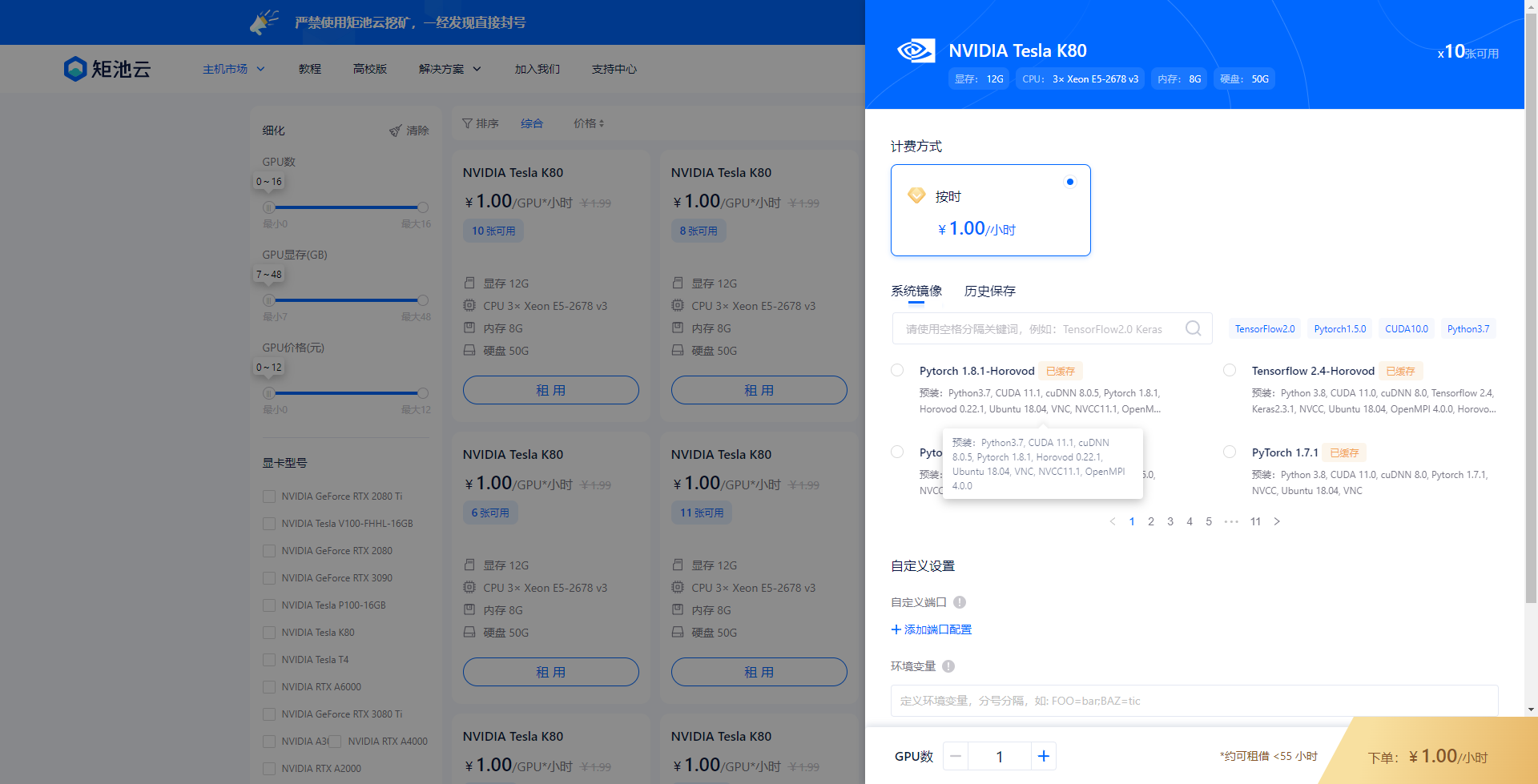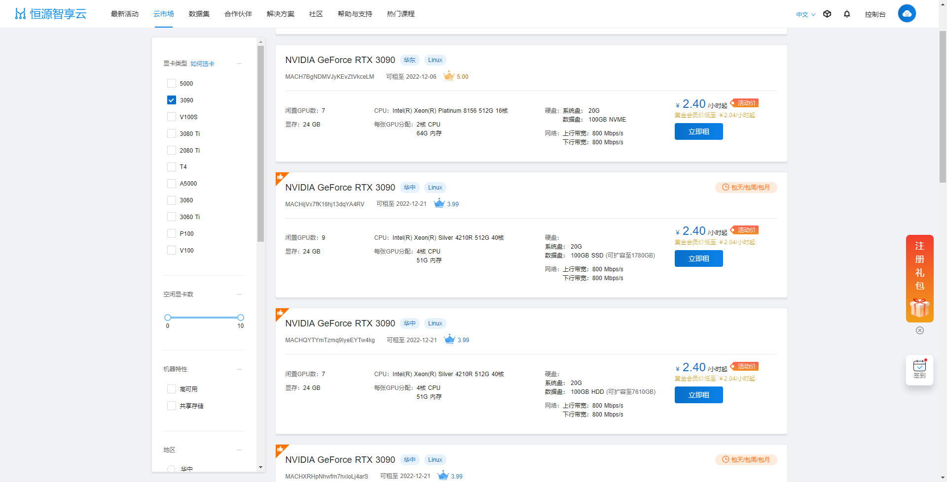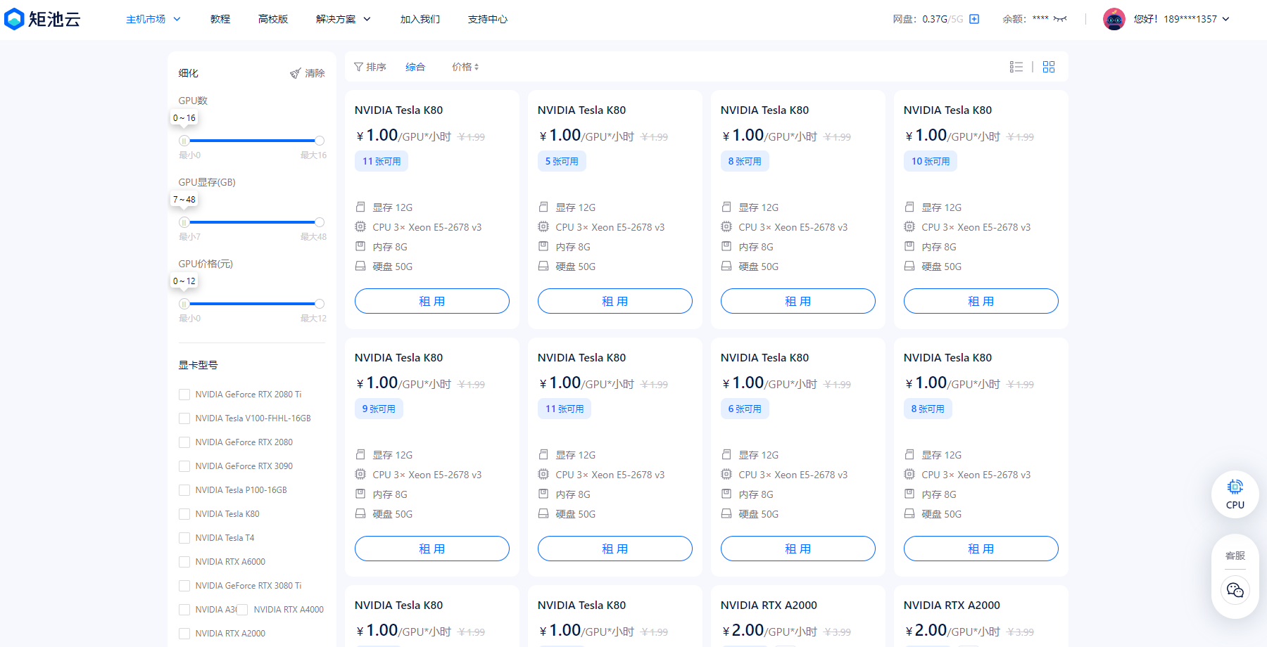 然后可以在官网充值,学生或老师有优惠,充值后直接在GPU主机市场租用服务器,系统镜像丰富,选择自己需要的就行。