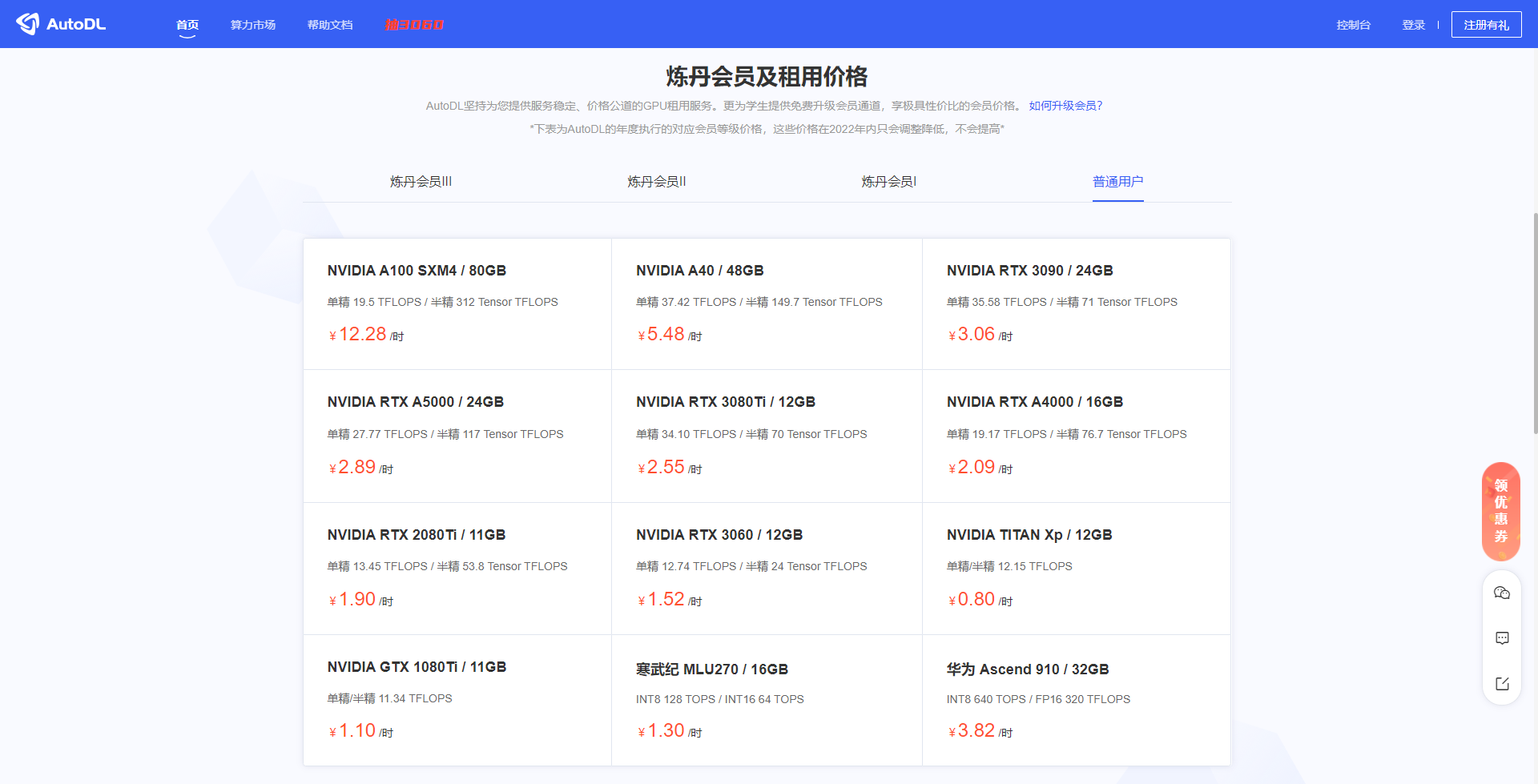 AutoDL针对不同会员等级有不同的优惠,学生可以免费升级会员,性价比较高。官网:AutoDL-品质GPU租用平台-租GPU就上AutoDL