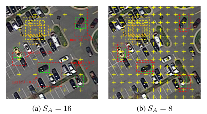 针对小目标检测,作者认为特征融合和有效采样是关键。对于anchor-based来说,anchor的铺设方式直接影响正样本采样率。经典的anchor铺设方式和特征图的分辩率有关,也就是anchor铺设的步长(C2-C5上的anchor步长分别是4,8,16,32)。随着网络加加深,特征图分辨率下降,anchor的步长扩大,常常会导致小目标的采样丢失,如下图所示: