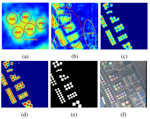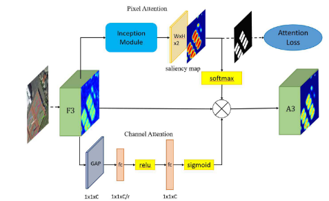 过多的噪音可能会混淆物体信息,物体之间的界限将变得模糊,导致漏检并增加虚警。因此,有必要增强物体特征并削弱非物体特征。为了更有效地捕捉复杂背景下小物体的特征,文章设计了一种有监督的多维注意力网络(MDA-Net),如下图所示。具体来说,在基于像素的注意网络中,特征图F3通过具有不同大小卷积核进行卷积运算,学习得到双通道的显著图(参见上图d)。这个显著图显示了前景和背景的分数。选择显著图中的一个通道与F3相乘,得到新的信息特征图A3(参见上图c)。需要注意的是,Softmax函数之后的显着图的值在[0,1]之间。换句话说,它可以降低噪声并相对的增强对象信息。由于显著图是连续的,因此不会完全消除背景信息,这有利于保留某些上下文信息并提高鲁棒性。