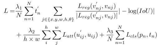 最理想的角度回归路线是由蓝色框逆时针旋转到红色框,但由于角度的周期性,导致按照这个回归方式的损失非常大(参见上图右边的Example)。此时模型必须以更复杂的形式回归(例如蓝色框顺时针旋转,同时缩放w和h),增加了回归的难度。为了更好地解决这个问题,我们在传统的smooth L1 损失函数中引入了IoU常数因子。在边界情况下,新的损失函数近似等于0,消除了损失的突增。新的回归损失可分为两部分,smooth L1回归损失函数取单位向量确定梯度传播的方向,而IoU表示梯度的大小,这样loss函数就变得连续。此外,使用IoU优化回归任务与评估方法的度量标准保持一致,这比坐标回归更直接和有效。IoU-Smooth L1 loss公式如下:
